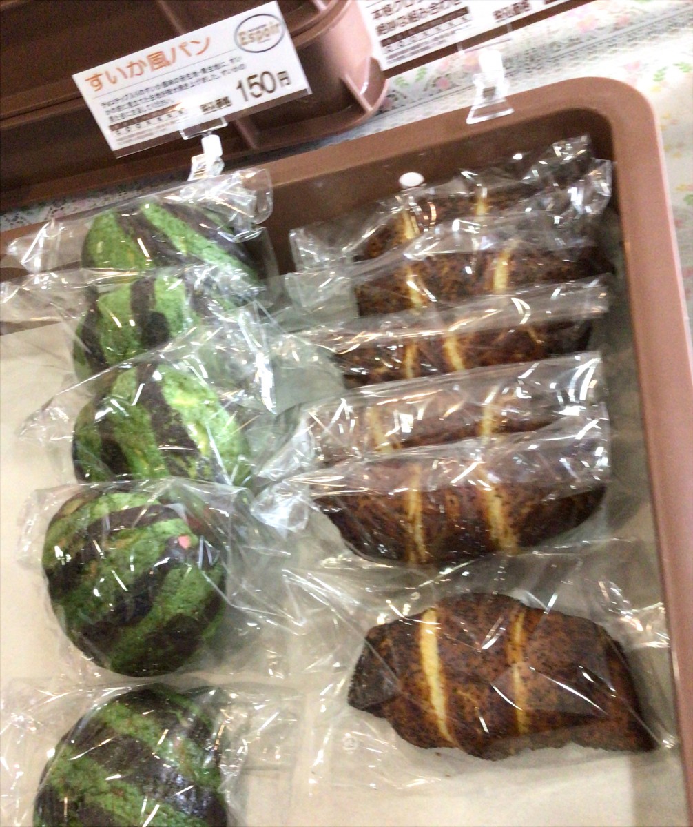 ちょうどお昼のお腹のすく時間帯、焼きたてのパンが並ぶ頃にお客様が一番多くなります。7月の新発売「すいか風パン」は、ちゃんとすいか果汁を練りこんだチョコチップの種が入っていて、本当に「すいか」のようですね。他にも大豆ミートを使用したミートパン、野沢菜わさびフランスパン、レモンチキンデニュッシュ、ハニーレモンブリオッシュなど新発売商品が並べられて大人気でした。