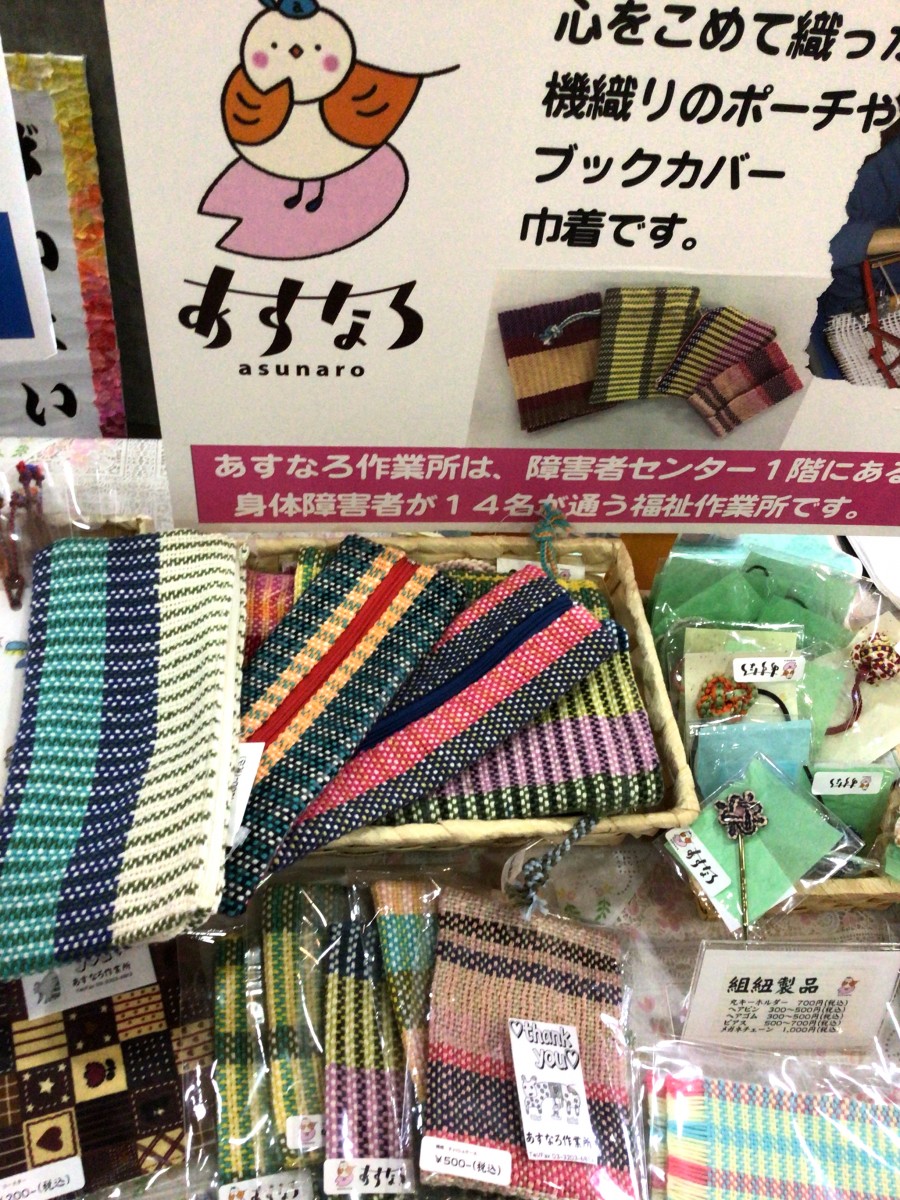 手作りならではのやさしい味わいのある「あすなろ作業所」で作成した機織り(はたおり)のブックカバーや巾着。裏布もミシンでしっかり縫われてあり風合いがとても素敵ですね。手に取られた方は、中の始末もきれいなので驚かれていました。
