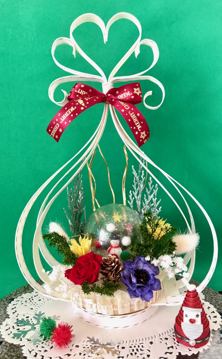 スノードーム風パーツや色鮮やかな薔薇、ヒムロスギなどのドライフラワー、木の実、クラフトバンドなどを使って素敵なクリスマスオブジェを作りませんか。